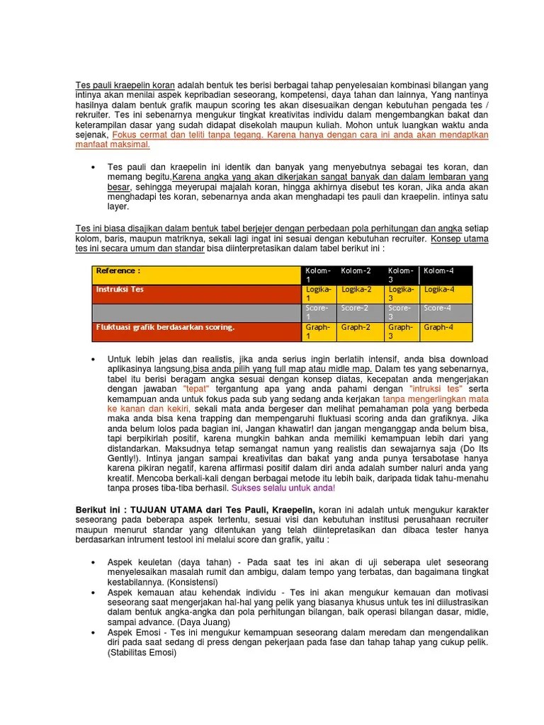 While the apa manual does not specify a single font or set of fonts for professional writing, it does recommend a few fonts that are widely available. Khusus tes pauli, ukuran kertas pengerjaan seukuran kertas koran. Sedangkan ukuran kertas tes kraepelin relatif lebih ringkas, yaitu hanya berukuran a4 atau f4 dan tidak diberikan kertas tambahan. Karena itu juga tes pauli disebut dengan tes koran. Anda juga bisa mempelajari beberapa tes psikotes seperti wartegg test, tiu 5 test, army alpha test. Jan 19, 2018 · apa itu tes kraepelin? Apabila diperoleh angka dengan hasil grafik naik menunjukkan bahwa peserta didalam bekerja akan menunjukkan peningkatan (dapat berprestasi) 3. Menurut yang saya baca,inilah jawaban yang kalian cari. Apabila diperoleh dengan hasil grafik datar itu menunjukkan bahwa peserta di dalam hal bekerja stabil 2. Untuk lebih jelasnya kami kan membahasa mengenai test kraepelin mulai dari pengertian, tujuan test kraepelin, arah karir tes kraepelin, fungsi dan implementasi tes kraeplin. Nama kraepelin diambil dari penemu jenis tes psikotes ini yaitu emilie kraepelin Kemudian richard pauli mengembangkannya untuk mendiagnosa kemampuan bekerja, dan hasil pengembangannya disebut dengan tes pauli. Tes ini sering digunakan dalam proses rekrutmen tenaga kerja baru di suatu perusahaan/ instansi.